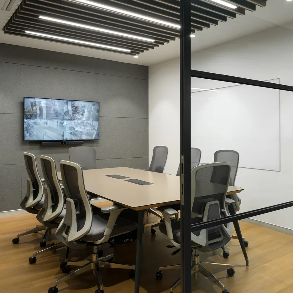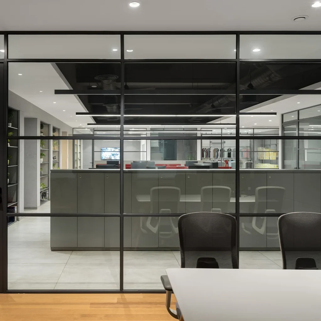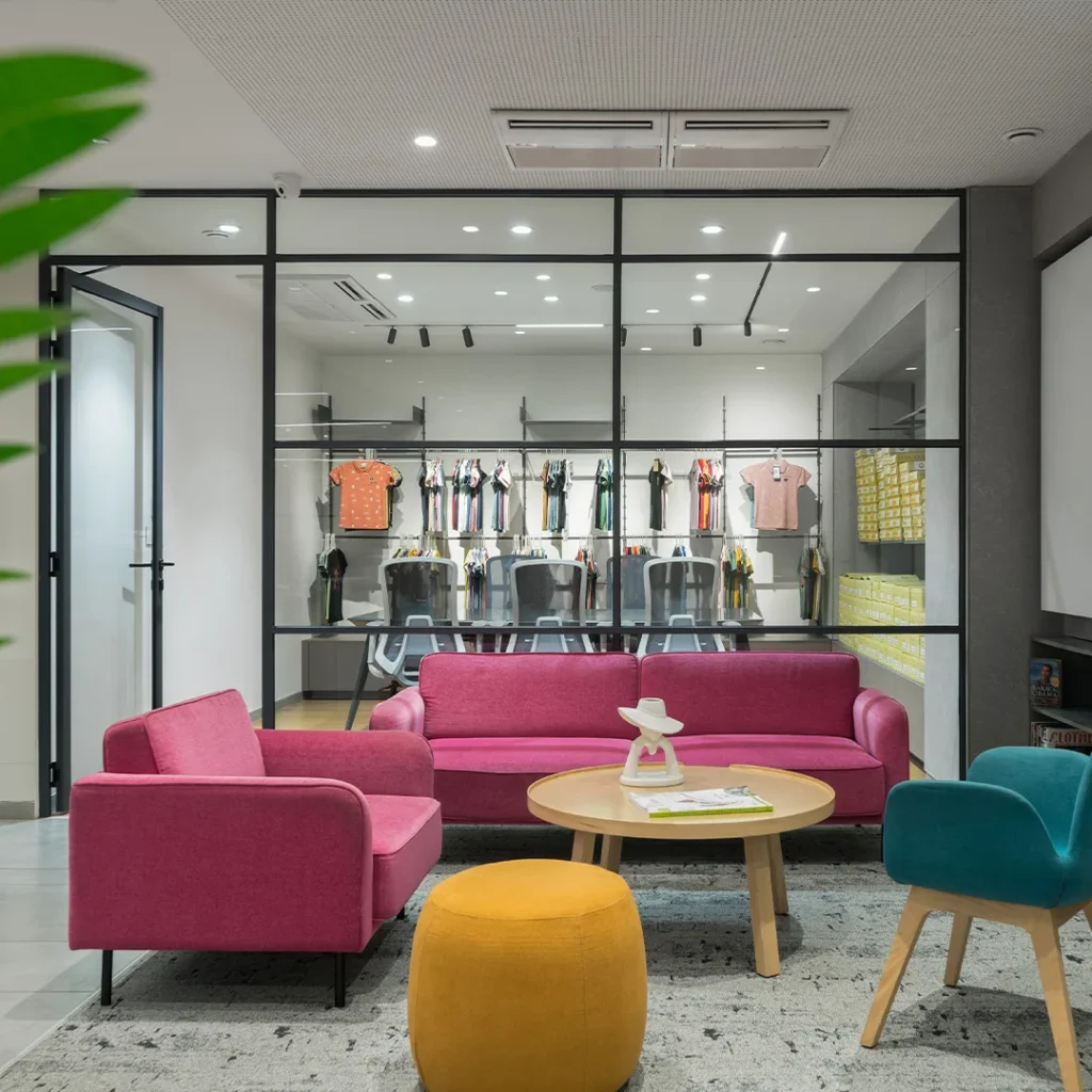 A spacious reception sets a welcoming first impression, while thoughtfully designed display rooms showcase the company’s garment collections in an elegant and accessible format. Soft colour tones, high open ceilings, and warm wood finishes create a refined yet inviting work environment.