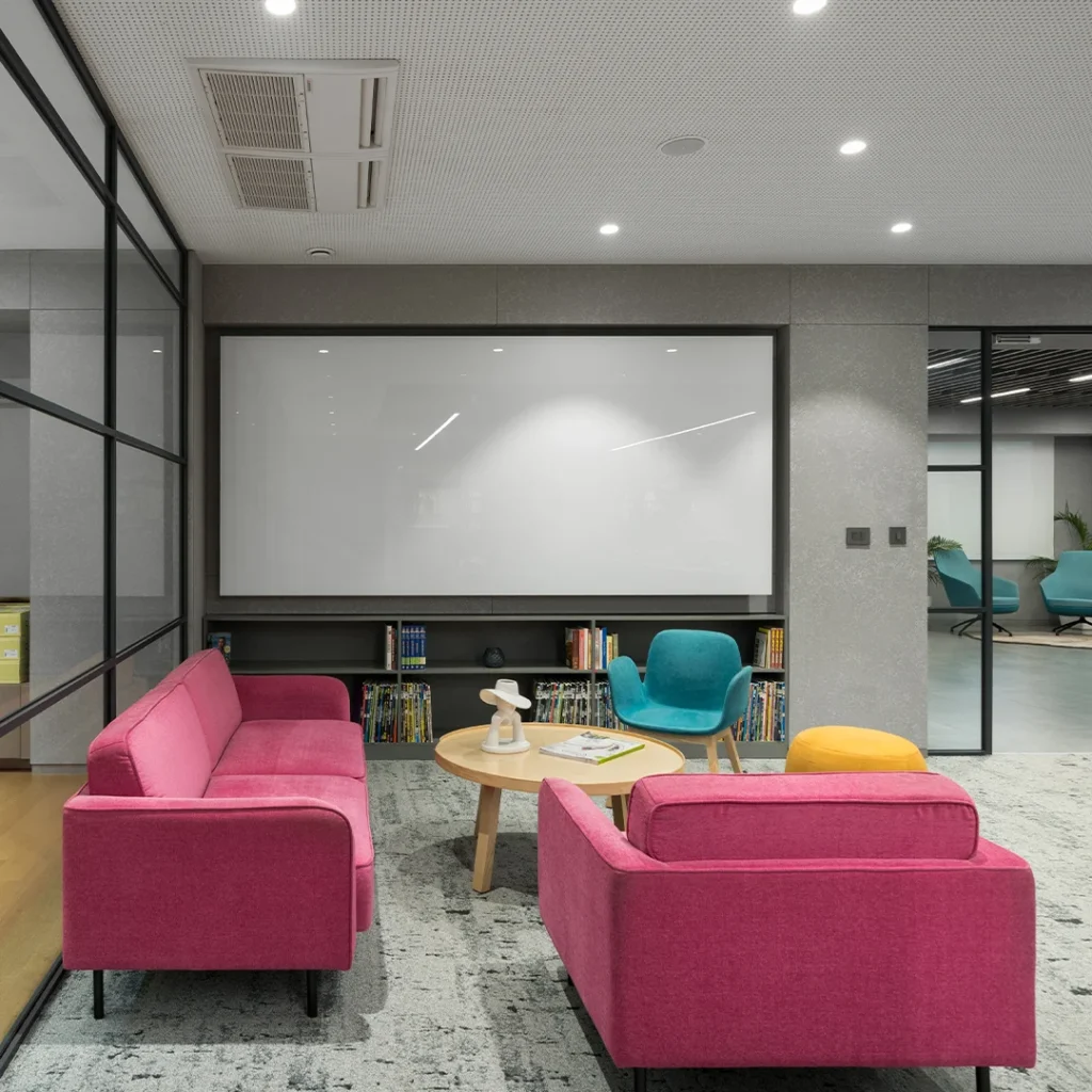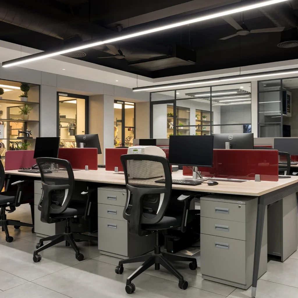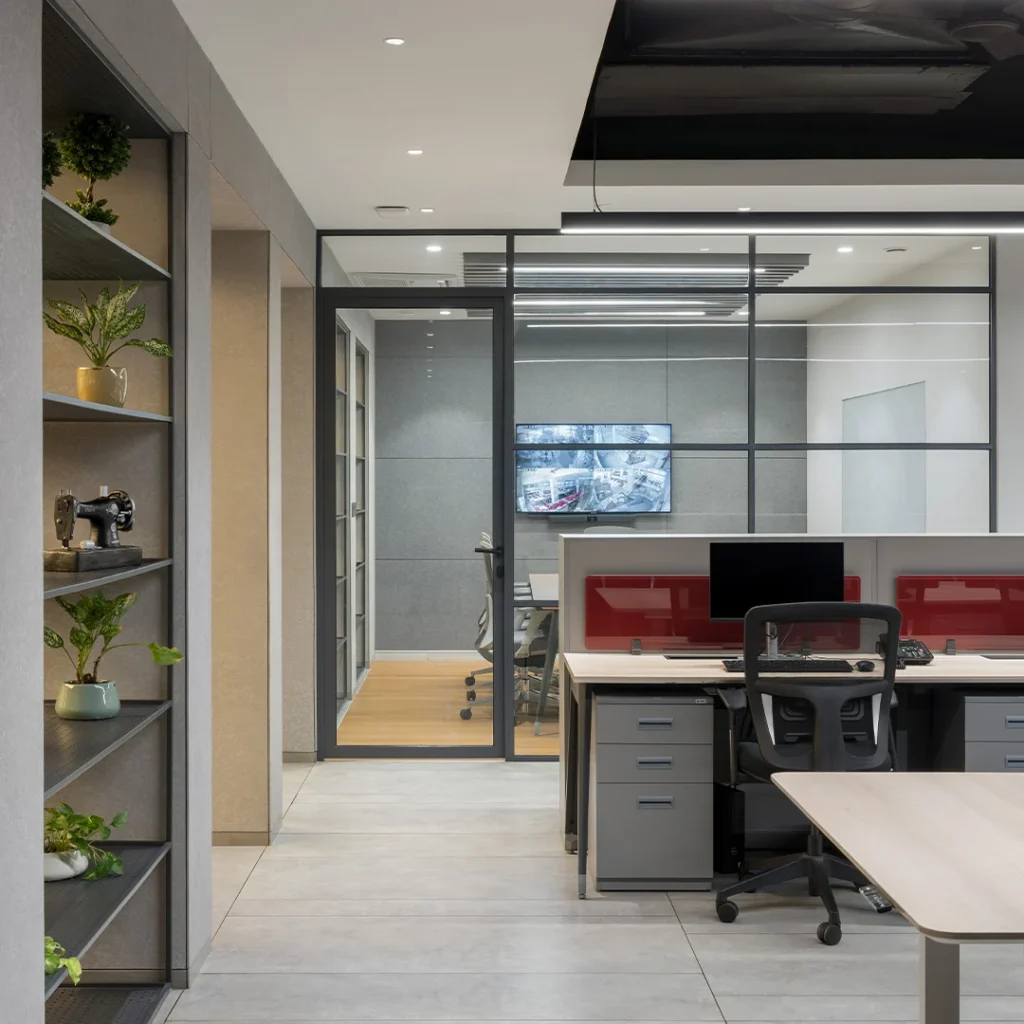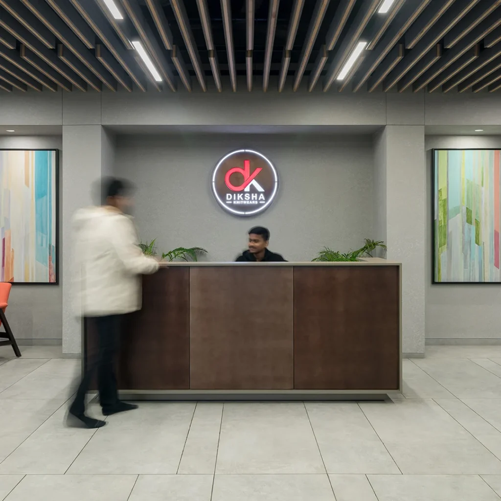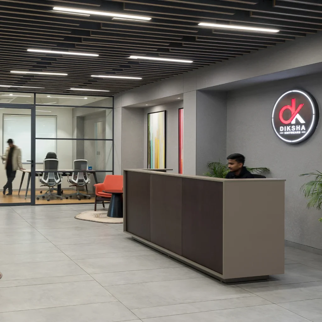 We designed Diksha Knitwear’s 6,500 sq. ft. corporate office as a contemporary, open-plan workspace that reflects the brand’s focus on quality, innovation, and craftsmanship.