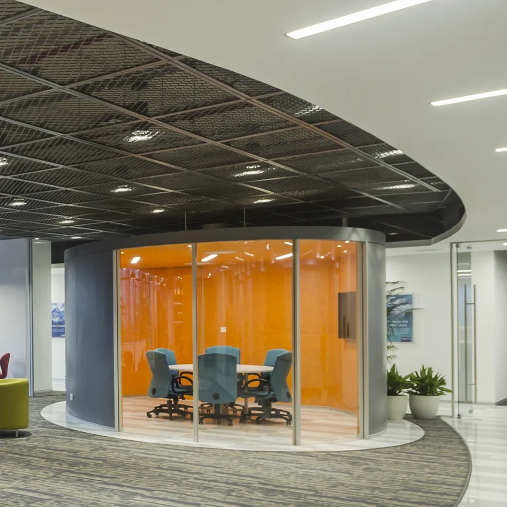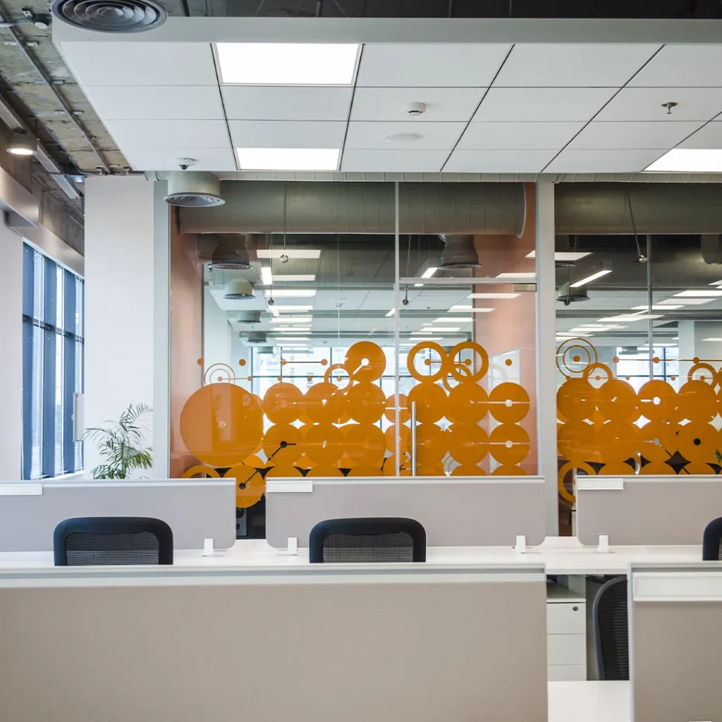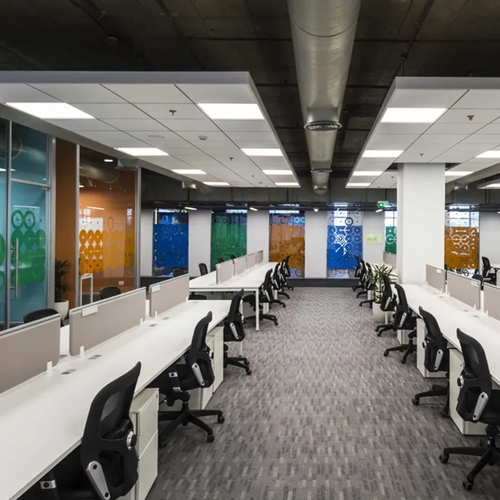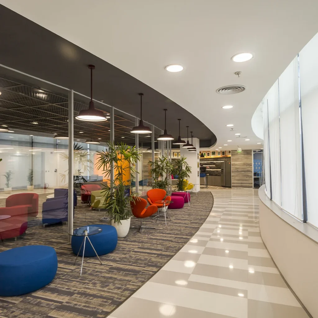 The layout balances focused work zones with collaborative spaces and breakout areas, enabling seamless idea exchange. Abundant natural light, combined with a neutral grey base and vibrant accent colours, energises the environment and enhances productivity.