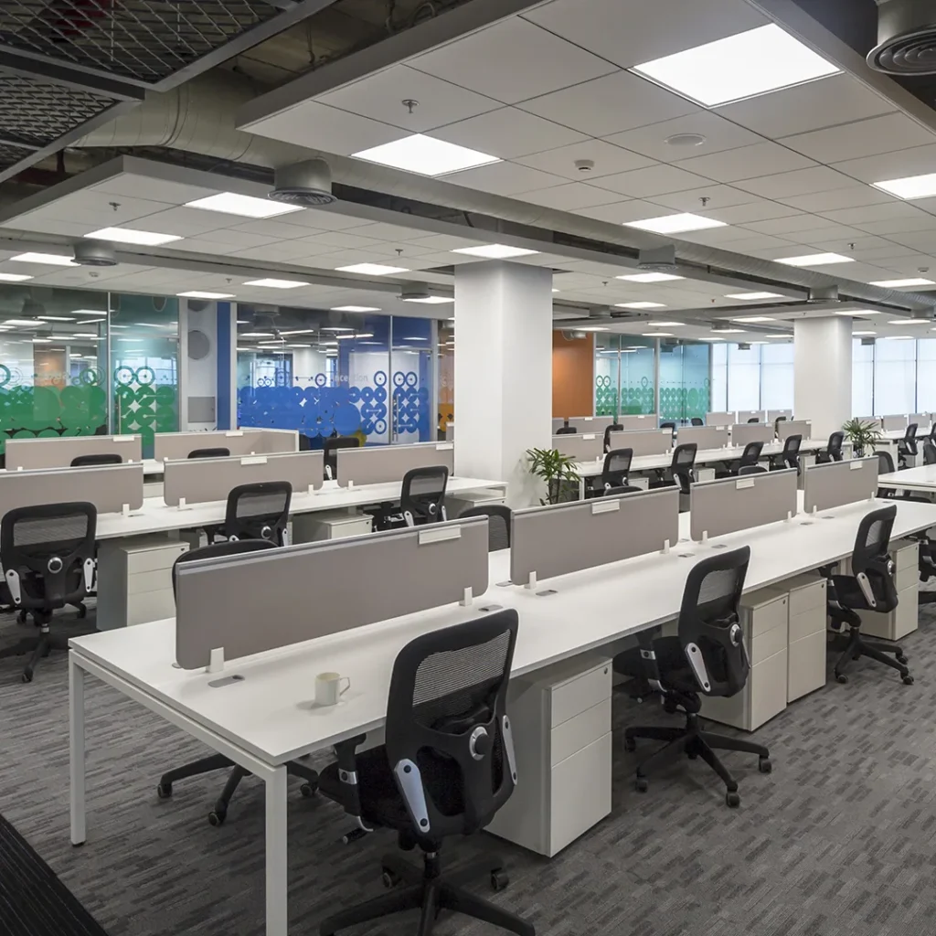 Each zone features distinct materials and finishes— from a bold, design-led reception with stone textures, metal ceilings, and curved glass, to open workstations with exposed RCC ceilings and acoustic panels. Informal areas such as the cafeteria, gym, and recreation zones create a relaxed, people-centric work culture.